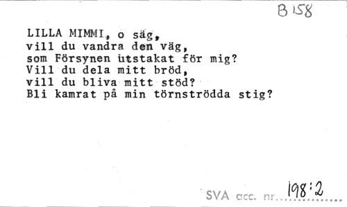 //// ö //// LILLA MIMMI, o säg, //// vill du vandra den väg, //// som Försynen iitstakat för mig? //// Vill du dela mitt bröd, //// vill du bliva mitt stöd? //// Bli kamrat på min törnströdda stig? //// SVA ccc. ////