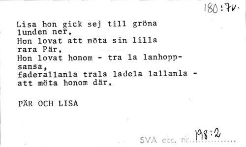 //// Lisa hon gick sej till gröna lunden ner. //// Hon lovat att möta sin lilla rara Pär. //// Hon lovat honom - tra la lanhopp-sansa, //// faderallanla trala ladela lallanla -att möta honom där, //// PÄR OCH LISA //// SVA ccc. nr..,.7.0. ////
