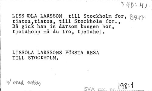 //// nu //// LISS (DLA LARSSON till Stockholm for, tiatoa,tiatoa, till Stockholm for., Då gick han in därsom kungen bor, tjolahopp må du tro, tjolahej. //// LISSOLA LARSSONS FÖRSTA RESA TILL STOCKHOLM. //// V muh nv^y^ \WA //// no •1 ////