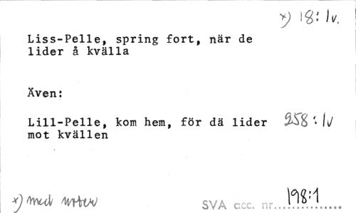 //// >j ig; i v. //// Liss-Pelle, spring fort, när de lider å kvälla //// Även: //// Lill-Pelle, kom hem, för dä lider m ij mot kvällen //// 4nit/V SVA ccc. n;-...)^?.'.:... ////