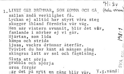 //// fl« %y N //// 1. LIVET GER DRÖMMAR, SOM KOMMA OCH GÅ (-helft, Vtoö* sällan ändå verklighet £å. Lyckan ej alltid har styrt våra steg skuggor ibland förmörka vår väg. Men när vintern svunnit, blir det vår, v^ //// famlande i mörker ej vi går. ^ //// Hjärtan, som lida ^ //// kämpa och strida ljusa, vackra drömmar återfår. Tvivlet du har känt så mången gång skingras lätt av sol och fågölsång. //// Sluta att sörja //// grubbla och spörja > //// oron förgår - ^ //// är det nå nvtt en påna hii-r vå-r. V,g. vänd i ////