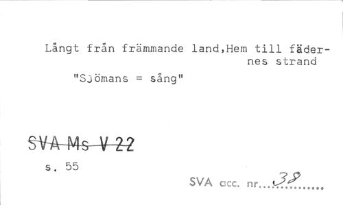 //// Långt från främmande land,Hem till fäder- //// nes strand //// "Sjömans = sång" //// SYA-M-s-¥-2-2 //// s. 55 //// SVA ccc. nr. ////