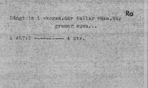 //// Ra //// Långt in i skogen,där tallar vHxa,dar //// .'., - • . • • ' •• ¦ ' • '"ii"'-'* " '• , • • "•¦ - „ granar; susa... //// A 467:2---4 str.' //// "'. '"* ¦".'.' :' - , . -i'"-< V' ////