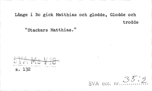 //// Länge i Bo gick Matthias och glodde, Glodde och //// trodde //// "Stackars Matthias." //// ^ rr. f^i w \j ~ 0 //// s. 132 //// 3 5~' 9 //// SVA ccc. nw.y^—/.."rr. ////