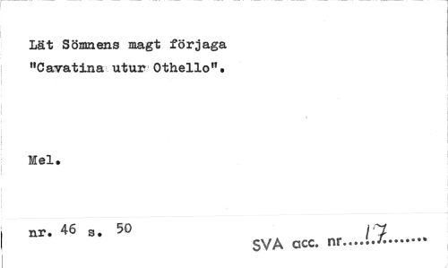 //// Lät Sömnens magt förjaga "Cavatina utur Othello". //// Mel. //// nr. 46 s. 50 j j //// SVA ccc. nr...!./... ////