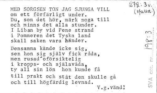 //// ¦jL tH- ' i V //// MED SORGSEN TON JAG SJUNGA VILL ( //// om ett förfärligt under. ' ) //// Du, som det hör, märk noga till och minns det alla stunder. //// I Liban by vid Pene strand rr> //// i Pommeren det Tyska land //// skall saken vara händer. ^ //// Densamma kände icke sig, sen hon sig själv fick råda, men rusad'oförsiktelig i kropps- och själaväda, ty all sin lön hon kunde få //// till prakt och ståt den skulle gå och till högfärdig levnad. //// V.g.vänd! ////