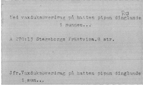 //// kcj //// i red yaxduksöverdrag på hatten pipan dinglande //// i munnen.. //// A 270:13 Stegeborgs't ristvisa.3 str, //// •J fr. V ax duks överdrag på hatten pipan dinglande i _mun.., ////