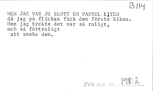 //// 13114 //// MEN JAG VAR JU BLOTT EN PARVEL 1JTEN då jag på flickan fick den första kiken. Men jag tyckte det var så roligt, och så förtroligt att smeka dem. //// SVA ccc. nr...?!7! ////