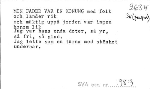 //// s&w //// MIN FADER VAR EN KONUNG med folk ^ ' //// och länder rik ^^(Klhw) //// och mäktig uppå iorden var ingen y //// honom lik //// Jag var hans enda doter, sä yr, så fri, så glad. //// Jag lekte som en tärna med skönhet underbar. //// SVA ccc. nr.. J.jO.. ////