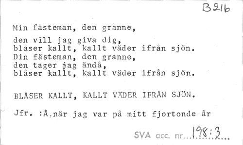 //// Min fästeman, den granne, //// den vill jag giva dig, //// blåser kallt, kallt väder ifrån sjön. //// Din fästeman, den granne, //// den tager jag ändå, //// blåser kallt, kallt väder ifrån sjön. //// BLÅSER KALLT, KALLT VÄDER IFRÅN SJÖN. Jfr. :Å,när jag var på mitt fjortonde år //// SVA ccc. nr.. J.jO.. ////