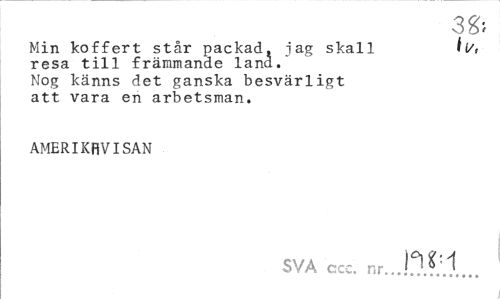 //// 3 fr //// Min koffert står packad, iag skall ti/, //// resa till främmande land. //// Nog känns det ganska besvärligt //// att vara en arbetsman. //// AMERIKRVISAN //// SVA ccc. nr,..!.!?;!... ////
