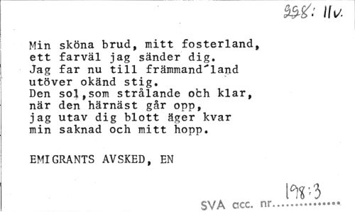 //// II* //// Min sköna brud, mitt fosterland, ett farväl jag sänder dig. Jag far nu till främmand^land utöver okänd stig. Den sol,som strålande obh klar, när den härnäst går opp, jag utav dig blott äger kvar min saknad och mitt hopp. //// EMIGRANTS AVSKED, EN //// hr'3 //// SVA ccc. nr... ////