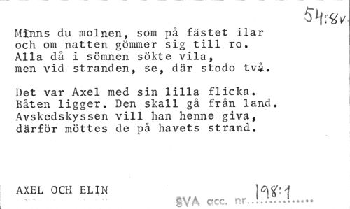 //// Minns du molnen, som på fästet ilar och om natten gömmer sig till ro. Alla då i sömnen sökte vila, men vid stranden, se, där stodo tvä. //// Det var Axel med sin lilla flicka. Båten ligger. Den skall gå från land. Avskedskyssen vill han henne giva, därför möttes de på havets strand. //// AXEL OCH ELIN I W 1 //// SVA. acc. nr... ////