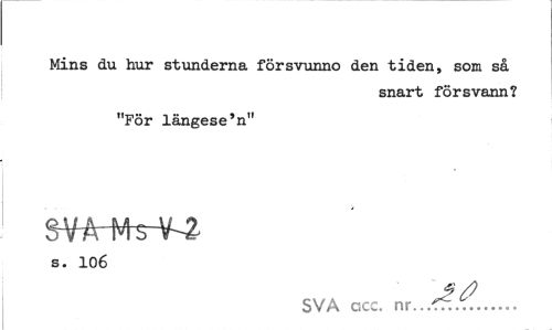 //// Mins du hur stunderna försvunno den tiden, som så //// snart försvann? //// "För längese'n" //// S-VT //// s. 106 //// SVA gcc. ... ////