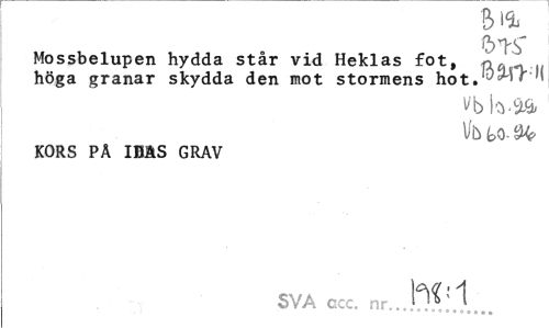 //// h 1*1 OT-S" //// Mossbelupen hydda står vid Heklas fot, höga granar skydda den mot stormens hot. //// vb //// KORS PÄ IDAS GRAV //// SVA ccc. nr...ff.l. ////