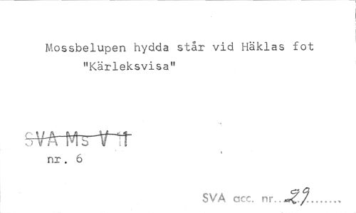 //// Mossbelupen hydda står vid Häklas fot //// "Kärleksvisa" //// m^krtrr //// nr. 6 //// SVA ccc. nr..JZj... ////