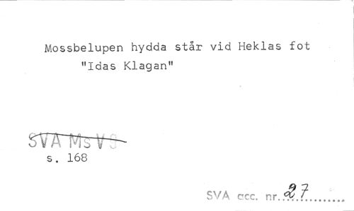 //// Mossbelupen hydda står vid Heklas fot "Idas Klagan" //// ^iTmrr— //// s, 168 //// SVA ccc. nr. ////