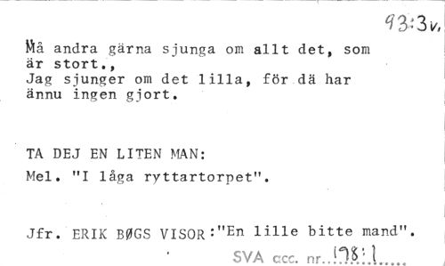 //// andra gärna siunga om allt det, som är stort., //// Jag sjunger om det lilla, för dä har ännu ingen gjort. //// TA DEJ EN LITEN MAN: //// Mel. "I låga ryttartorpet". //// Jfr. ERIK B0GS VISOR-'"En lille bitte mand". //// SVA ccr.. nr. //// ns-1 ////