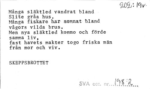 //// cMj> lcW' //// Många släktled vandrat bland Slite gråa hus. //// Många fiskare har somnat bland vågors vilda brus. Men nya släktled kommo och förde samma liv, //// fast havets makter togo friska män från mor och viv. //// SKEPPSBROTTET //// SVA ccc. nr. MS ////