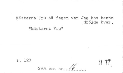 //// Mästarns Fru så fager var Jag hos henne //// dröjde kvar. //// "Mästarns Fru" s. 128 //// SVA ccc. nr. // ////