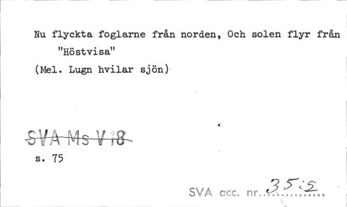 //// Nu flyckta foglarne från norden, Och solen flyr från //// "Hö st vi sa" (Mel. Lugn hvilar sjön) //// s. 75 //// SVA ccc. m.Å^rh.. ////