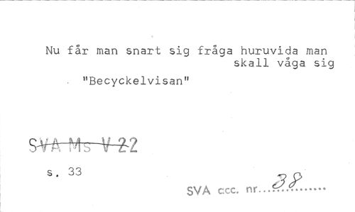 //// Nu får man snart sig fråga huruvida man //// skall våga sig //// "Becyckelvisan" //// s , 33 r\ //// SVA ccc. nr... ////
