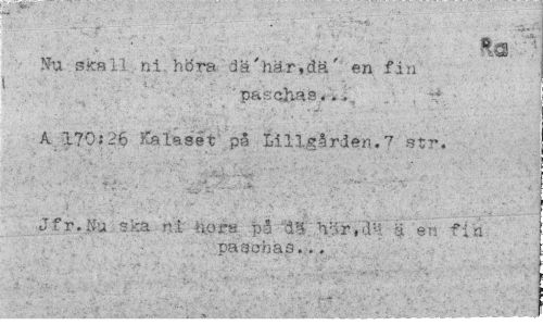 //// jfu skall ni höra dä'här,dä' en fin 1 pasqMs.*... //// A 170:26 Kalaset på lillgården.7 str. //// Jfr. Nu ska ni åioi-a på >y$r ,å:A ä 'en fin - . paschas... ////