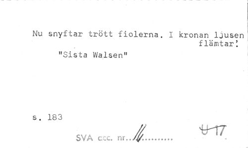 //// Nu snyftar trött fiolerna. I kronan ljusen //// flämtar //// "Sista Walsen" s. 183 //// / tM7 //// SVA ccc. nr../{/... ////