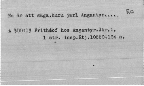 //// I //// ¦ //// r , //// Nu är att säga,huru jarl Anganty?* //// A 500J13 Frithdof hos Angantyr.Str,l, //// 1 str. insp.Rtj,10660?104 a, //// j A ////