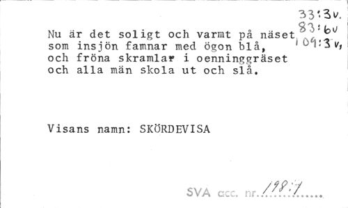 //// 33'.Sv. //// ÖO ; , , //// Nu är det soligt och varmt på näset , som insjön famnar med ögon blå, '3 v, //// och fröna skramlar i oenninggräset och alla män skola ut och slå. //// Visans namn: SKÖRDEVISA //// 5VA ccc. nr./^f, ////