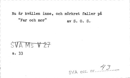 //// Nu är kvällen inne, och mörkret faller på "Far och mor" av S. 0. S. //// SVTMs-n? //// s. 33 //// i r ... //// SVA ccc. nr... ////