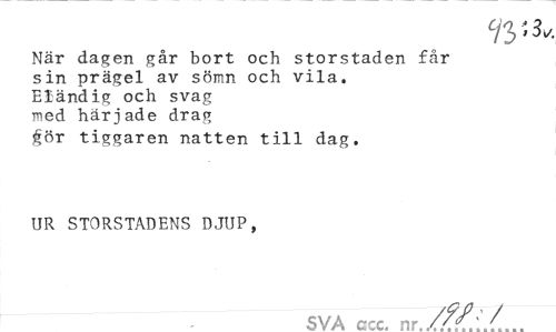 //// När dagen går bort och storstaden får //// sin prägel av sömn och vila. //// Eländig och svag //// med härjade drag //// gör tiggaren natten till dag. //// UR STORSTADENS DJUP, //// SVA nr c nr ////