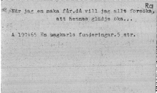 //// Ra //// 1 Här jag en maka får,då vill jag allt försöka, //// att hennes glädje öka... //// Å 190:65 . "Sn ungkarls funderingar. 5 str. //// ¦ " //// - . ¦ //// : - ' ' ' ' //// * ' ' ' ' - //// ' . : ¦ ... : . ////