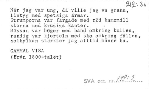 //// 5 V //// När jag var ung, då ville jag va grann, //// lintyg med spetsiga ärmar. //// Strumporna var färgade med röd "kamomill //// skorna med krusiga kanter. //// Mössan var höger med band omkring kullen, //// randig var kjorteln med sko omkring fållen, //// solhylkan stärkter jag alltid månne ha. //// GAMMAL VISA (Från 1800-talet) //// SVA ccc. nr ////