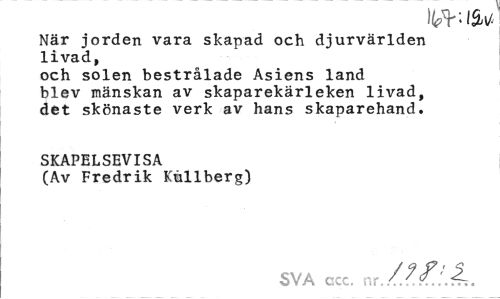 //// När jorden vara skapad och djurvärlden livad, //// och solen bestrålade Asiens land blev mänskan av skaparekärleken livad, det skönaste verk av hans skaparehand. //// SKAPELSEVISA //// (Av Fredrik Kullberg) //// SVA ccc. nr ////