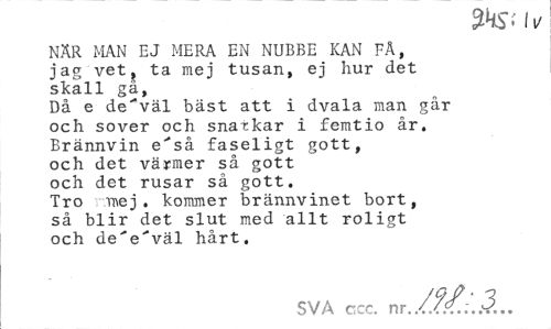 //// it/ //// NÄR MAN EJ MERA EN NUBBE KAN FÄ, jag vet, ta mej tusan, ej hur det skall gå, //// Då e de^väl bäst att i dvala man går //// och sover och snackar i femtio år. //// Brännvin e'så faseligt gott, //// och det värmer så gott //// och det rusar så gott. //// Tro r.n\ej . kommer brännvinet bort, //// så blir det slut med allt roligt //// och de'e'väl hårt. //// SVA ccc. nr./.?/.;. 3., ////