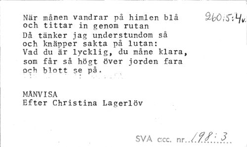//// När månen vandrar på himlen blå och tittar in genom rutan Då tänker jag understundom så och knäpper sakta på lutan: Vad du är lycklig, du måne klara, som får så högt över jorden fara och blott se på. //// MÅNVISA //// Efter Christina Lagerlöv //// SVA ccc. nr../.f.f.iJ. ////