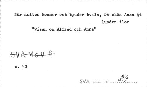 //// Här natten kommer och bjuder hvila, Då skön Anna åt //// lunden ilar //// "Wisan om Alfred och Anna" //// s. 50 //// SVA ccc. nr. ////