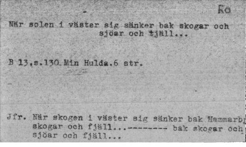 //// V'¦ Ro //// Mr solen i väster sig sänker bak skogar och //// s,1öar och trjäll... //// B 13ts.l30. Min Hulda.6 str. //// Jfr. När skogen I väster sig sänker bak Tia®®art //// skogar och fjäll...--- bak skogar oct //// s.ioar och fiäll... . ___ ////