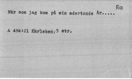 //// Ra //// När som jag kom på min adertonde år...». //// A 484J21 Kärleken/5 str. //// '•/" . ' ' ' rf ¦. ":¦'. ' -rf ' ' ' 5 "/rf.'^rf". ',7- TJrfrf ; •¦"V"?' rf : V' "'i''; • rf Ä^ P ' rfrf //// ¦ ' . . v ' 'rf .rf ////