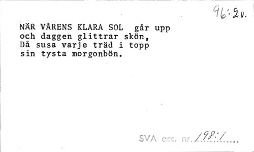 //// %'-% l/. //// NÄR VÅRENS KLARA SOL går upp och daggen glittrar skön, Då susa varje träd i topp sin tysta morgonbön. //// SVA c-c. nr... ////