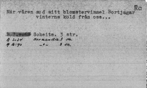 //// När våren ned sitt bloffisterviramel Bortjagar vinterns köld från oss... //// Soheits. 3 str, //// f /i-f3 3 ////