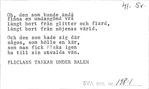 //// Oh, den som kunde änd§. //// finna en undangömd vra //// långt bort från glitter och flärd, //// långt bort från nöjenas värld. //// Och den som hade sig där någon, som hölle en kär, som man fick älska igen ha till sin utvalda vän. //// FLICLANS TANKAR UNDER BALEN //// SVA ccc. nr... ////