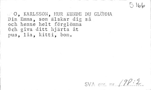 //// rö IM* //// O, KARLSSON, HUR KUNDE DU GLÖMMA Din Emma, som älskar dig så och henne helt förglömma Och giva ditt hjärta åt pua, lia, kitti, bom. //// SVA c"", nr. ////