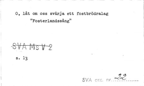 //// O, låt om oss svärja ett fostbrödralag "Fosterlandssång" //// I SVA Ms v-g //// s. 13 //// l SVA ccc. nr. ... ////