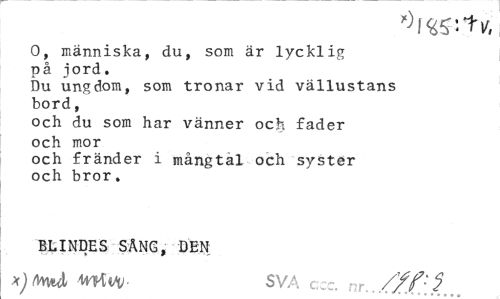 //// O, människa, du, som är lycklig på iord. //// Du ungdom, som tronar vid vällustans bord, //// och du som har vänner och fader och mor //// och fränder i mångtal och syster och bror. //// BLINDES SANG, DEN //// MtfW- SVA ccc. nr. //f:<2 ////