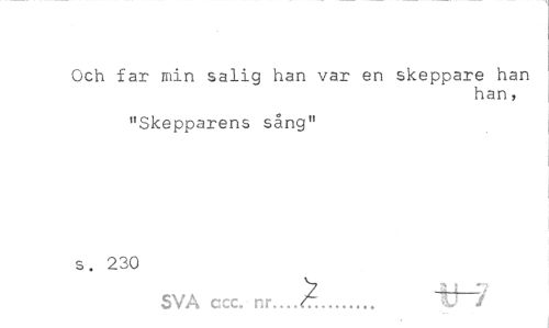 //// Och far min salig han var en skeppare han //// han, //// "Skepparens sång" s. 230 //// SVA ccc. nr. £... tH7 ////
