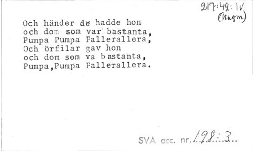 //// Och händer de hadde hon och dom som var bastanta, Pumpa Pumpa Fallerallera, Och örfilar gav hon och dom som va bastanta, Pumpa,Pumpa Fallerallera. //// SVA ccc. nr. //// 132-.3... ////