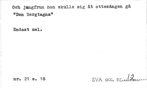//// Och 3ängfrun hon skulle sig åt ottesången gå "Den Bergtagna" //// Endast mel. //// nr. 21 s. 18 SVA acc, El J^w" ////