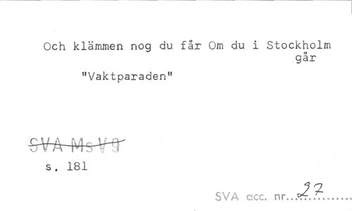 //// Och klämmen nog du får Om du i Stockholm //// går //// "Vaktparaden" //// cv-..,^--:" //// s. 181 //// SVÅ acc. nr. Ii ////